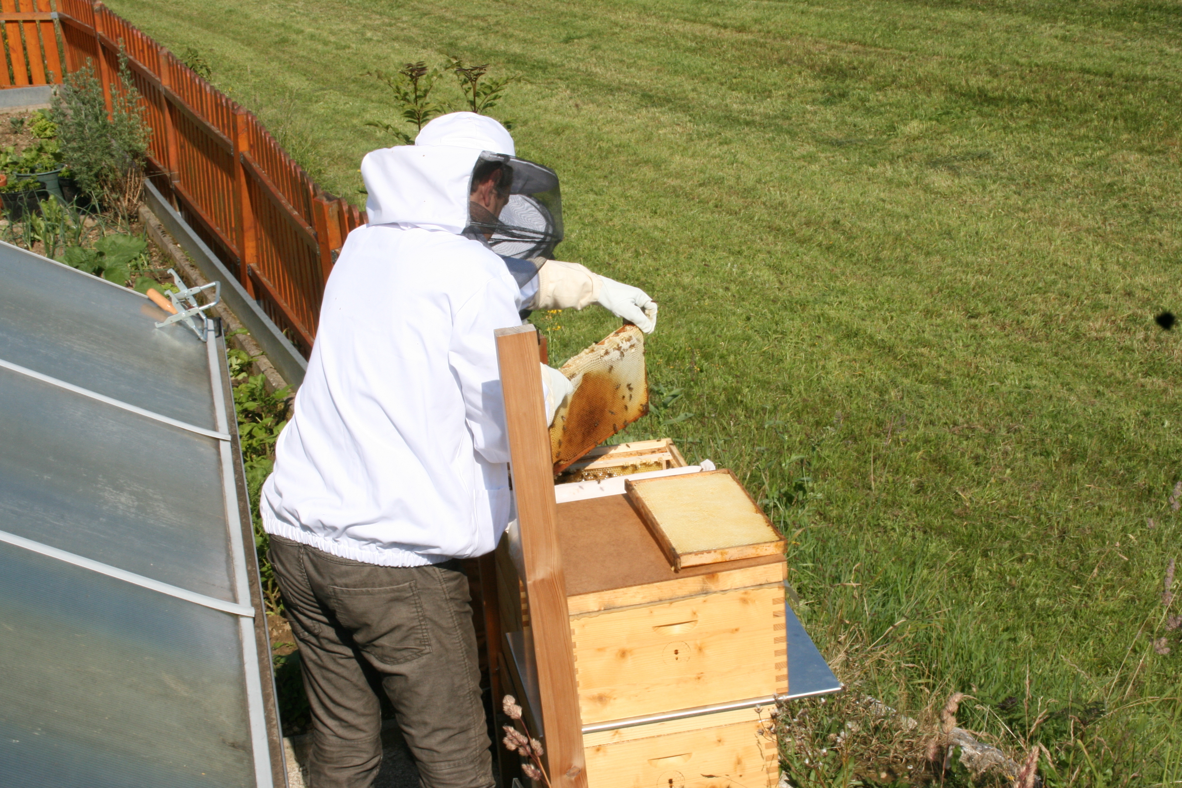 Vor einigen Jahren kam mein Sohn Bernhard aus der Hauptschule nach Hause, verschwand in der Werkstatt und hat einen Bienenkasten gezimmert und wollte ihn in die Wiese stellen. Denn im Biologieunterricht hat er gelernt, dass Bienen eine "Wohnung" brauchen und sich dann einnisten. Wir mussten ihn überzeugen, dass dies nicht so einfach geht und haben von der Tante meiner Frau einen "Leasing-Bienenstock" organisiert.