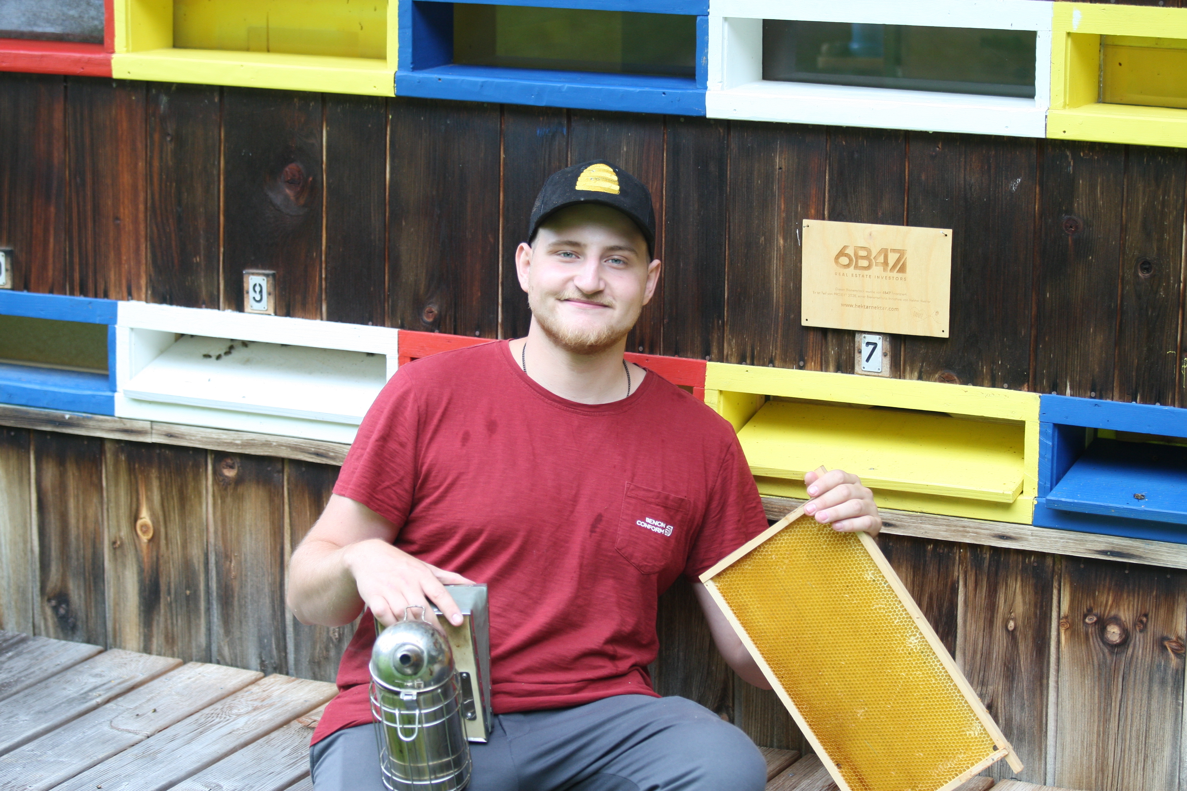 “Mein ersten Bezug zu den Bienen hatte ich als ich ein Kleiner Bub war und mit meiner Oma nach Ihnen schaute. Und da jetzt in meinem Freundeskreis ein richtiger Bienen-Boom ist, habe ich mich entschlossen unsere alte Imkerei wieder aufleben zu lassen.”