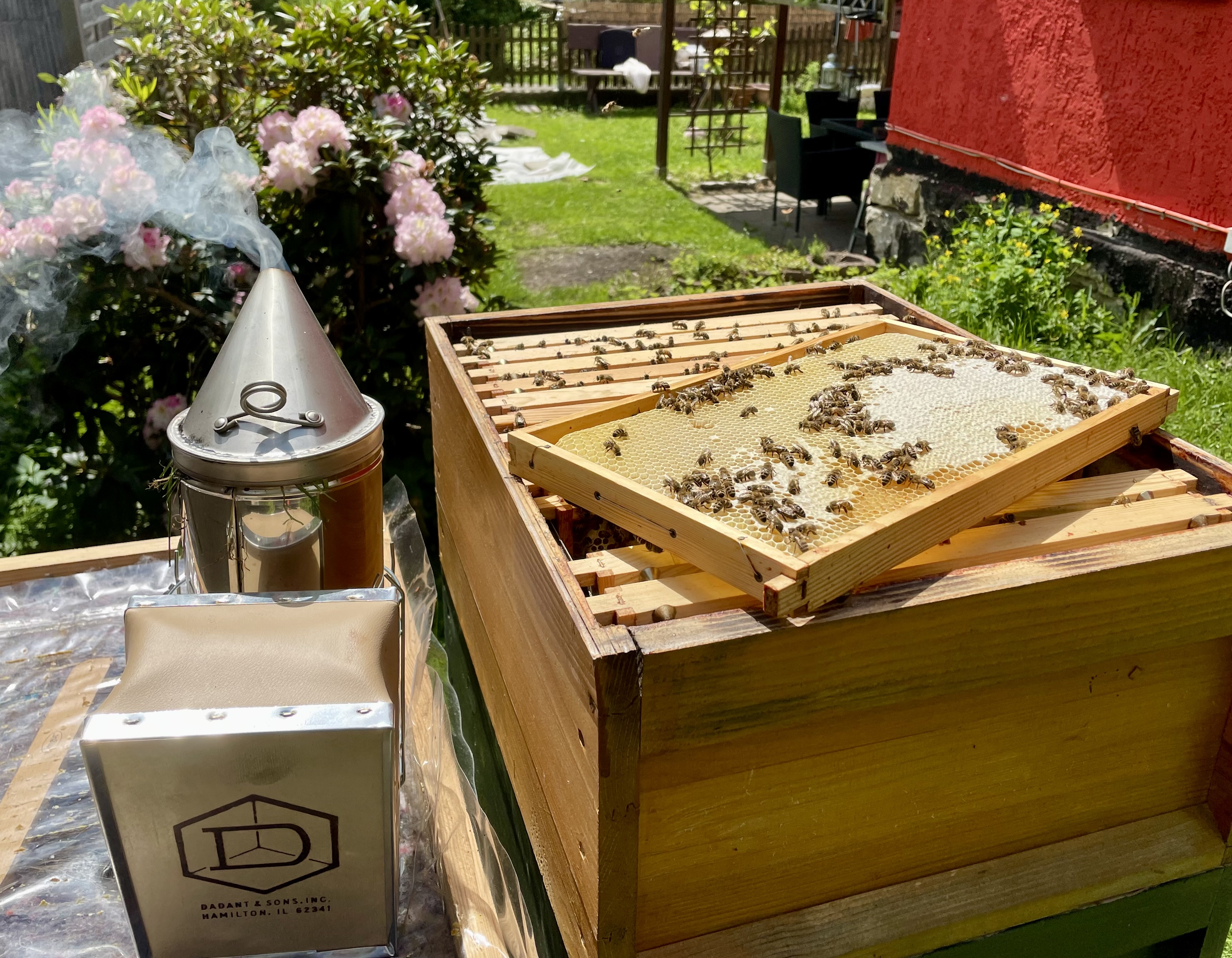 Ein Imker machte mich einmal auf den Satz aufmerksam "Honig aus EG und Nicht-EG Ländern", welchen man auf den Gläsern im Handel findet. Das war der Beginn dass ich mich mit dem Thema einmal auseinander setzte. Somit habe mir über Jahre (seit 2015) viel theoretisches Wissen angeeignet,und dabei festgestellt dass mich das Thema Imkerei und die Honigbiene immer mehr fasziniert. Die Sichtweise und Blick auf die Natur und die Vegetation änderte sich. Als erstes musste ein Forsythie - Strauch im Garten weichen, und jetzt steht dort eine Kätzchenweide. Über den Vorsitzenden des nächsten Imkervereines kam ich dann zu meinen ersten Bienen. Er lässt den natürlichen Schwarm zu, und ermöglichte es mir im letzten Jahr daran teilzuhaben. Ich habe es erlebt wie ein Volk schwärmt, durfte diesen Schwarm selbst fangen und mein Eigen nennen. Das war eine herausragende Erfahrung, ein absolutes Naturschauspiel welches mich total faszinierte. So kam ich zu meinen ersten Bienen, habe diese noch erfolgreich umgeweiselt und eine Buckfast Königin zugesetzt.