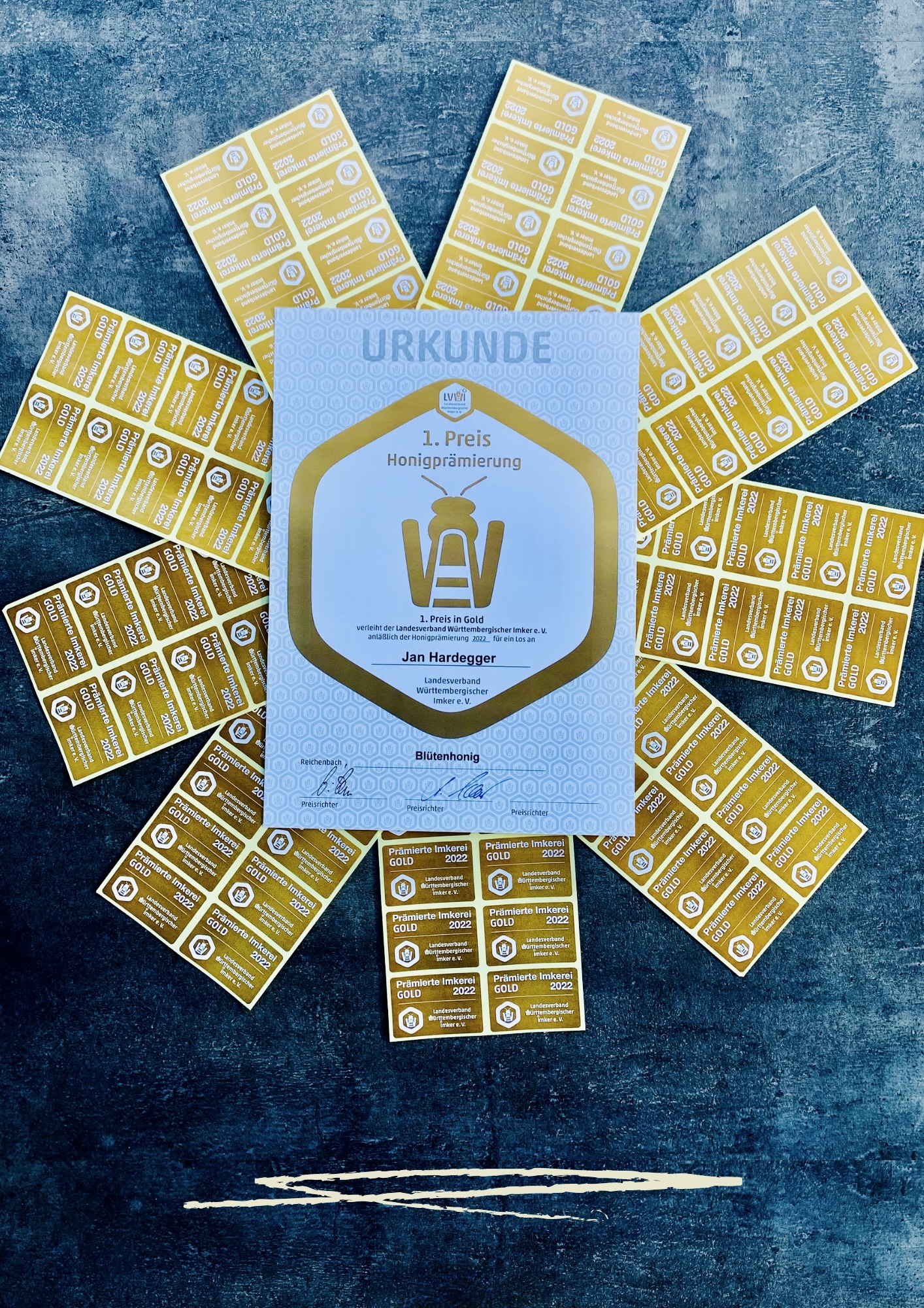 Ich heiße Jan, 22Jahre jung und studiere Wirtschaftswissenschaften an der Uni Ulm. Im Jahr 2019 habe ich mit der Imkerei begonnen, da ich meinen eigenen Honig ernten wollte. Mit 2 Völkern bin ich hierfür gestartet. Doch schnell kamen Freunde, bekannte und die Verwandtschaft auf mich zu als sie bemerkten mit wie viel Herzblut und Leidenschaft ich meine Imkerei betreibe. Seit dem wächst meine Völkerzahl mit der natürlichen Vermehrung der Bienenvölker mehr und mehr an, sodass ich mittlerweile bei 10 Völkern angelangt bin. Dieses Jahr wurde meine Imkerei vom Landesverband Württembergischer Imker mit GOLD ausgezeichnet. doch nicht nur das. Mein Blütenhonig erhielt sogar den 1. Preis. Ich bin sehr stolz meinen Kunden solch eine hohe Qualität bieten zu können.